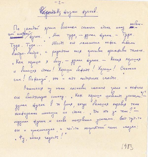 По залитой ярким весенним солнцем стене полз небольшой плотный жучок. “Мне туда, - думал жучок, - туда!.. туда!..” Шесть его маленьких ножек бежали быстро-быстро, с радостью неся красивое оранжевое тельце. “Как хорошо я бегу! – думал жучок. – Какая ровная, замечательная стена! Хорошо бежать! Хорошо! Сколько сил! Пожалуй, это и есть настоящее счастье.”