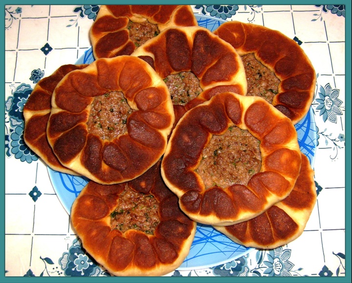 Фарш разделите на 10 частей, скатайте в ладонях вращательными движениями в одном направлении в колобки, которые расплющите в лепешки и выложите на лепешки из теста – свободные края заверните в одном направлении над фаршем - без необходимости, не защипывайте.
