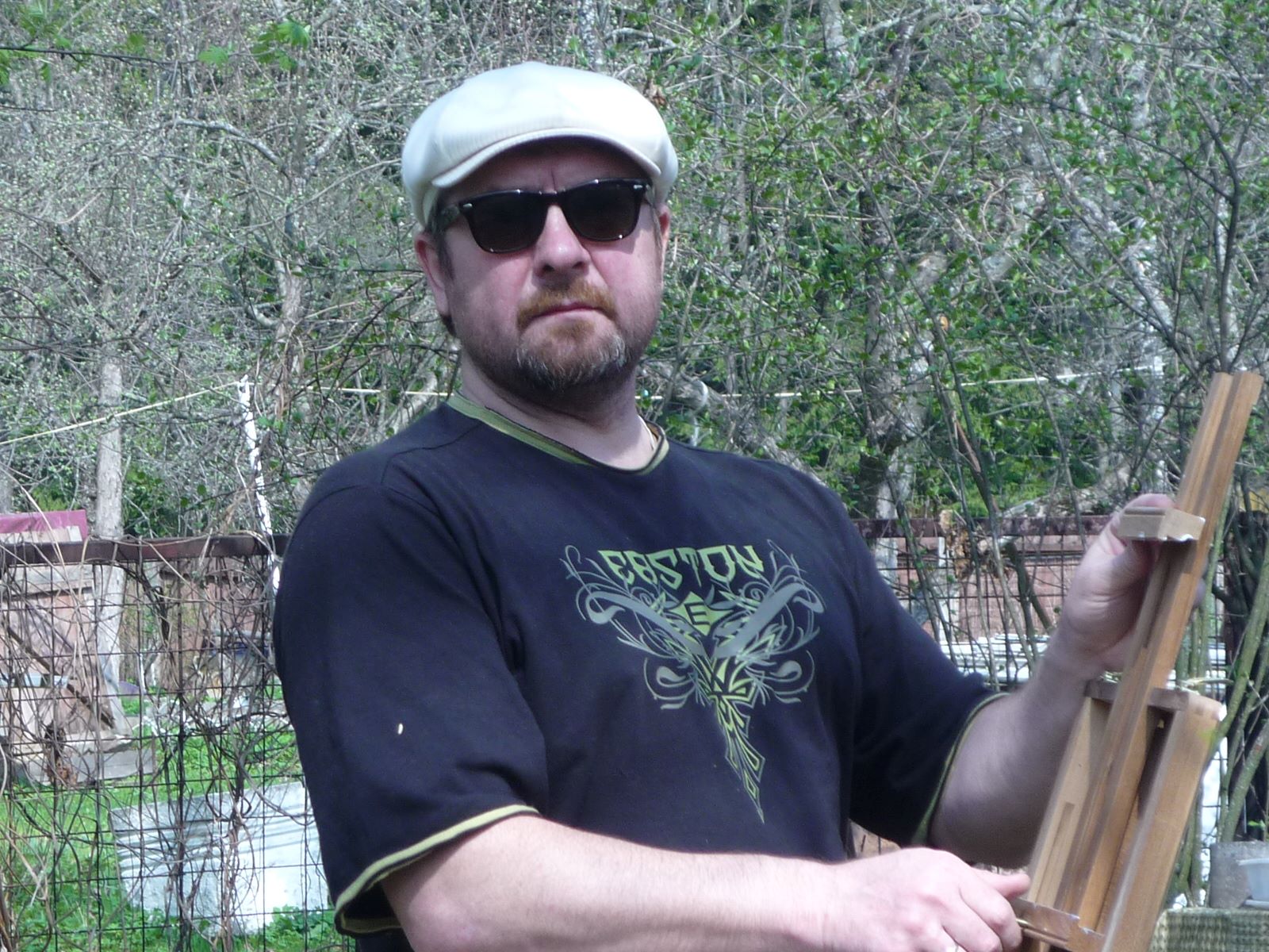 Автор и Архангел стоят перед картиной “Глаз Откровения”.