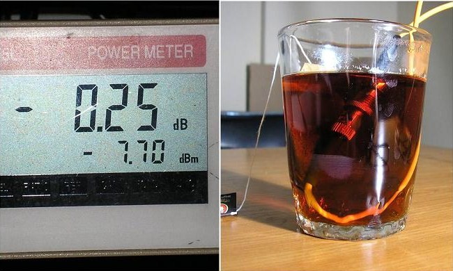 На фото - эксперимент: волоконно-оптический соединитель в водном растворе танина от "Липтон". Температура - 90. Потери - в норме.