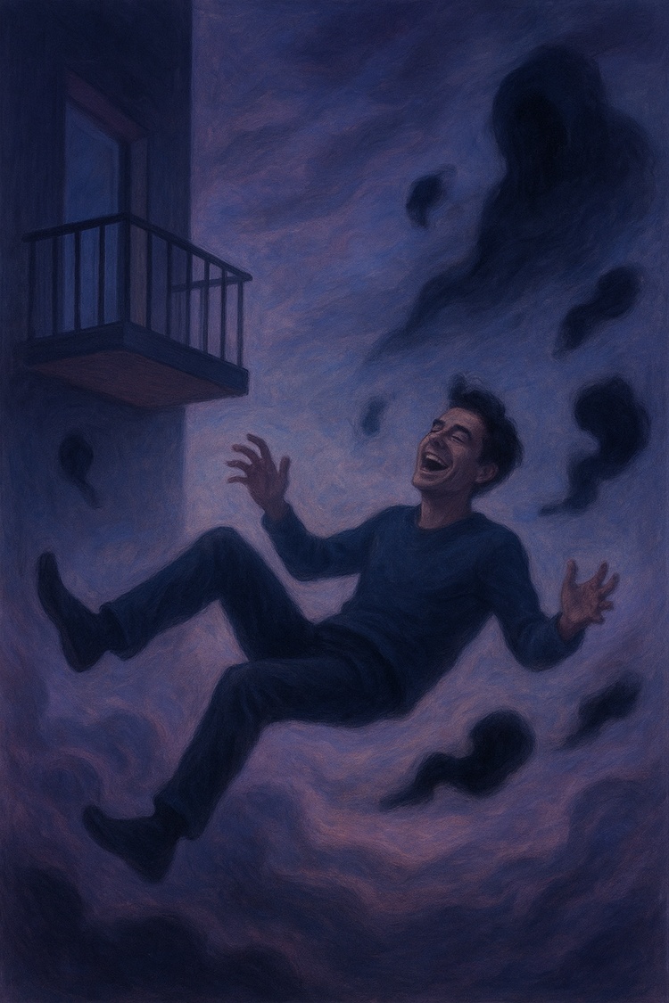 Зачем-то запутался в бельевых верёвках, устроил возню и смех разобрал окончательно — верёвки порвались, и я полетел вниз, безудержно хохоча.