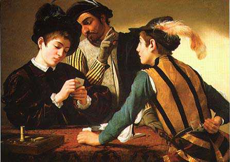 Картина построена так, чтобы прежде всего раскрыть сюжет, ввести зрителя в суть происходящего. Два шулера обыгрывают доверчивого юношу, который внимательно рассматривает свои карты, не замечая, что в них заглядывает сообщник его партнера и делает другому шулеру знаки, давая знать, какие карты на руках у их жертвы. Второй шулер достает нужные ему карты из сумки за спиной.