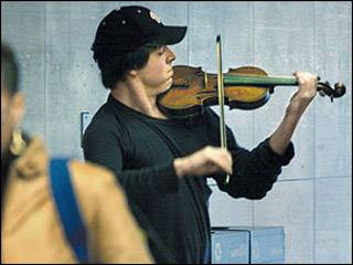 И он, переодевшись, чтобы его не узнали, стал играть в пешеходном переходе,
