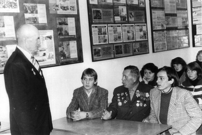 НА ФОТО: Ветераны войны Ф.Ф. Зеленский (стоит) и Я.И. Прасолов с учениками средней школы № 3 поселка Ставропольский Благодарненского района.