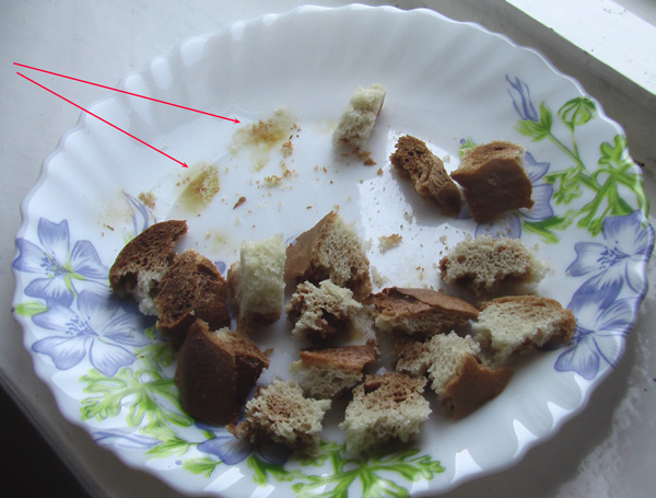 А на тарелке под немного подгоревшими сухариками образовался желтый маслянистый налет – деготь (отмечен красными стрелками на фото). Который и напомнил мне события полувековой давности...
