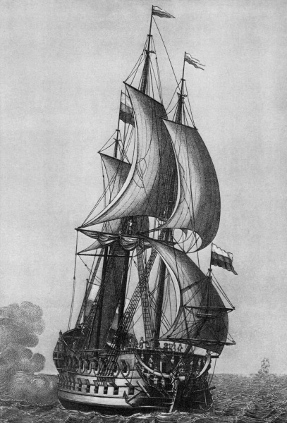 На рисунке: Первый российский линейный корабль "Гото Предестинация" под бело-сине-красным флагом (гравюра художника А. Шхонебека, из интернета).