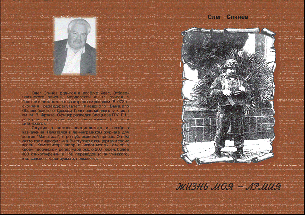СПИНЁВ ОЛЕГ АЛЕКСЕЕВИЧ – МАЙОР ЗАПАСА «СПЕЦНАЗА» ВОЗДУШНО-ДЕСАНТНЫХ ВОЙСК, ОФИЦЕР РАЗВЕДКИ, РЕФЕРЕНТ-ПЕРЕВОДЧИК ИНОСТРАННЫХ ЯЗЫКОВ (В Т. Ч. КИТАЙСКОГО), КАНДИДАТ В ЧЛЕНЫ СОЮЗА ПИСАТЕЛЕЙ РОССИИ. АВТОР И ИСПОЛНИТЕЛЬ БОЛЕЕ ДВУХСОТ ПЕСЕН, ЛАУРЕАТ И ДИПЛОМАНТ ТРЕХ ФЕСТИВАЛЕЙ БАРДОВСКОЙ ПЕСНИ, АВТОР КНИГ: «МЫ ИЗ ХХ ВЕКА», «ЖИЗНЬ МОЯ АРМИЯ». ПРЕДСЕДАТЕЛЬ КООРДИНАЦИОННОГО СОВЕТА КИРОВОГРАДСКОЙ ОБЛАСТНОЙРУССКОЙ ОБЩИНЫ ИМЕНИ А. С. ПУШКИНА, ЧЛЕН ЛИТЕРАТУРНОГО ОБЪЕДИНЕНИЯ «ПАРУС», ГЕРОЙ 6 ВИДЕОФИЛЬМОВ.