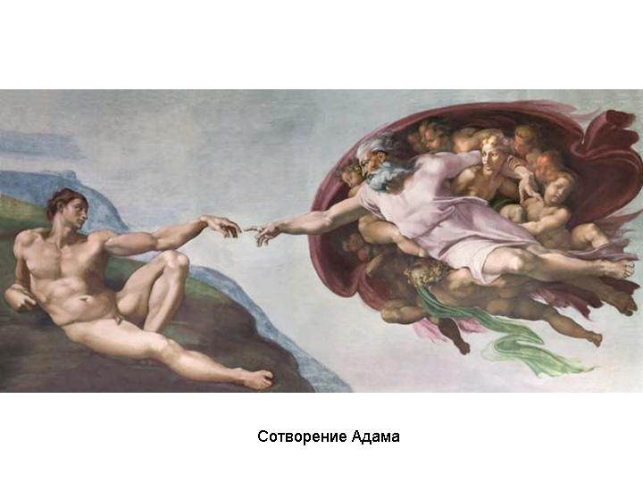 Одна из главнейших сцен росписи потолка. На ней показан сам момент пробуждения жизни, истолкованный Микеланджело как высвобождение дремлющих в человеке сил в результате волевого импульса Творца. Протягивая руку, Господь касается руки Адама, и это прикосновение вселяет в него энергию, волю. Адам здесь – это не просто первый человек, это – совершеннейший образ человека. Поражает красота и мощь его нагого тела, полного многообещающих, титанических сил. Недаром все ангельское окружение летящего Бога с таким изумлением смотрит на Его творение.