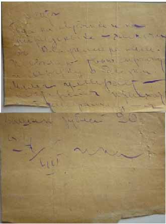 Митя. Была на Лубянке и на Спиридоновке – хлопочи во Владимире сам. Высылаю твою справку и справку о болезни. Мама умирает – постарайся приехать. (Неразборчиво; возможно, «Пришли»)….. телеграмму - я вышлю рублей 20.