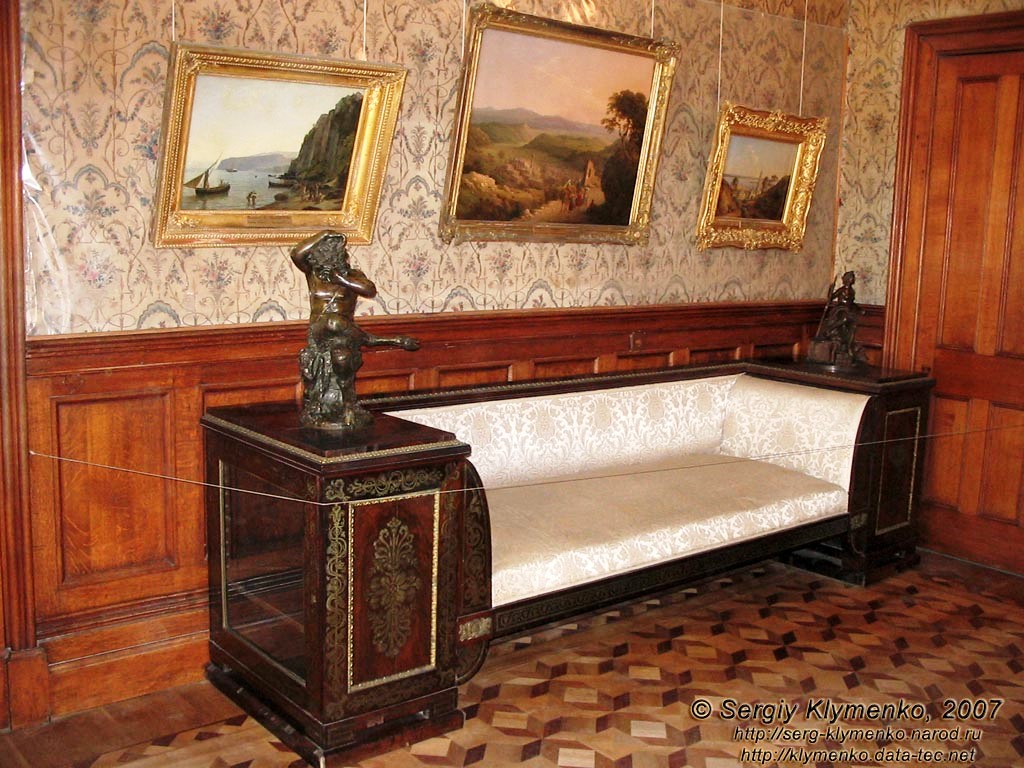 Из парадного кабинета в Ситцевую приемную был перенесён массивный диван орехового дерева. Диван имеет классическую форму, по бокам в нем устроены книжные шкафчики, сам диван отделан бронзой, а на шкафчиках установлены бронзовые скульптуры. Теперь диван со светлой обтяжкой (а был – красной).