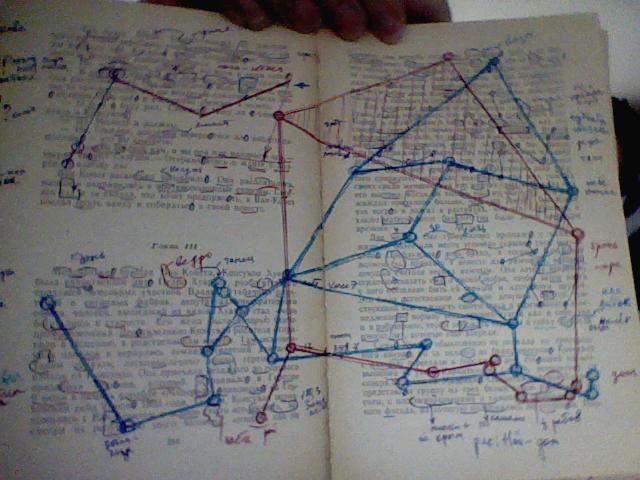 Грин А,те же 2 романа, стр 264...Буквы ОЙ дают в который раз странную постройку нашей старой солнечной системы из 11 звёзд - ДОМ...Крышу дома я заштриховал, а вот рис из букв ц мне пока не открылся...Попробуйте поработать...Из букв Я на левой стр+ 3 восклиц знака надо построить правую ногу у буквы М...Она должна быть чуть наискось, как и левая нога М и укажет вам на шифр ДИТЯ, см слово "ждите" -дитя,но см какое с ним рядом слово у тайной ноги - РАЗОРВИТЕ ЕГО!...А выше по лучу правой ноги буквы М, который мы нарисовали шифры: они- ИОН, каин,кака, каноЭ,с ПЛАТ (электроника), око и ниже нашего ш ДИТЯ см тут же где ш плат,слово "стороны" -ш ТОРСИОН-ион ( у Булгакова есть смотритель музея ИОНА)...