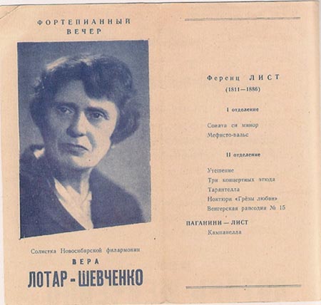 Замужество [второе замужество. МК] обозначило новый резкий поворот в судьбе пианистки. Владимир Яковлевич Шевченко был русским. Вера Августовна вместе с мужем оказывается в Ленинграде. Короткое время успешной работы, триумфальных концертов [Вера Августовна успела дать в Ленинградской филармонии лишь один концерт. МК] и неожиданное несчастье [арест мужа. МК].