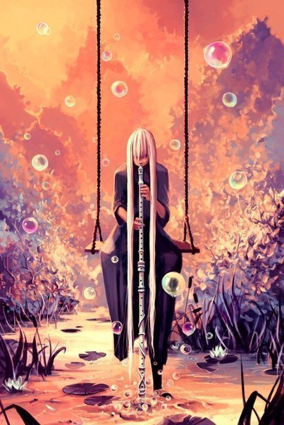 Я подскочила на месте, как ужаленная, и тут же оглянулась. И как я только сразу не заметила? Неподалеку росло высоченное дерево, верхушка которого, казалось бы, уходила прямо в небеса. Под ним на самодельных качелях, перекинутых через нижнюю ветку, сидел мальчик. Его белоснежные локоны спадали почти до самой земли, в руках он держал такую же длинную, как и его волосы, трубку со множеством отверстий.
