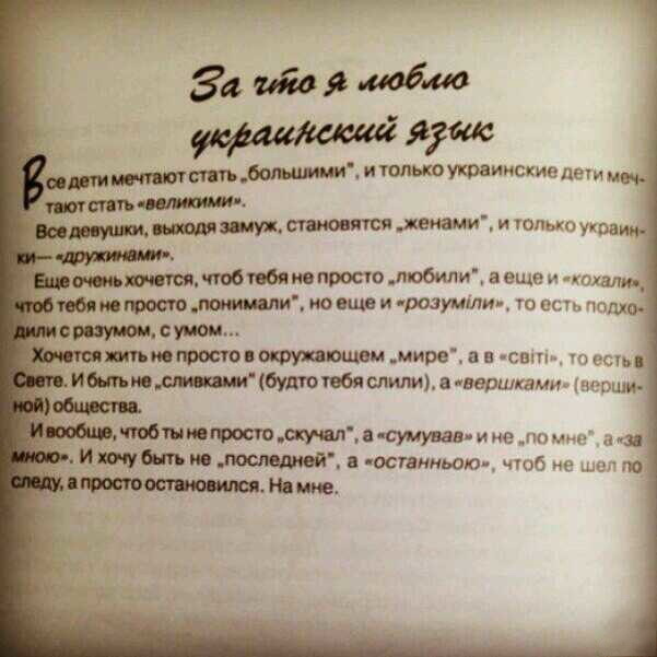 Сейчас по сети широкими шагами гуляет текст, в котором просто и доступно объясняется, почему значительнее быть великим, чем большим, и лучше чувственно кохать, чем просто любить, и что дружина вернее бесполезной жены, идущей за кем-то по невнятному языковому следу. Да, наверное это так. Не звучат по-русски красивые украинские слова. И любовь какой-то дешёвкой стала, и женщины русские плохими жёнами становятся, поскольку кохать своих мужчин не научены, а только любить их способны, скучно и паскудно, словно картошку, деньги или водку. И мужчины русские не понимают нихрена, поскольку разумом лишь украинский народ богат, поэтому и разумеют эти люди всё и великими становятся, и в свете приняты, чтобы вершиной его быть. Вот оно как. Кстати, вон плачет мальчик, которого родители зачем-то назвали Петей, а девочка Наталя ему сказала, что не будет с ним дружить, потому что Петя - это не красиво, а вот если бы Петрик, то да. А вот чем-то расстроенная девочка Алёнка.. да ладно, переживёт. Только в песочницу к Оленке и Михайлику ей не надо. Нельзя. Тоже некрасивое имя. В красивом языке таких имён быть не может.
