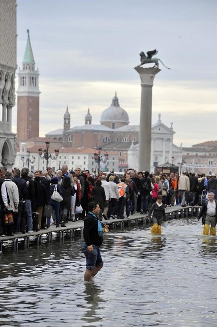 Сначала наша группа шла по совершенно сухой поверхности площади, мощённой каменными плитами, потом мы все залезли на те самые подиумы и встали в длинную очередь из туристов, медленно передвигаясь к центральному входу в собор Святого Марка. Часа через два после интересной экскурсии по залам собора, спустившись по ступенькам с верхних этажей вниз, увидели, что в нижней части собора пол весь в воде. Выходим на улицу - вся площадь затоплена по колено водой. Вот эти самые подиумы оказывается специально и предусмотрены для такого случая. Пришлось через всю площадь, балансируя на них, пробираться к более сухим местам. Итальянцы уже давно привыкли к таким приливам и отливам, которые могут происходить неожиданно и не один раз на дню.