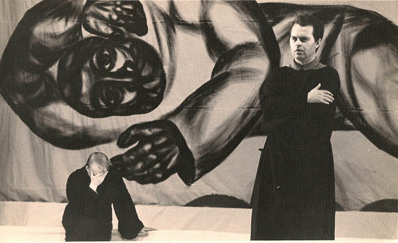 Сзади хорошо видна голова и лицо лежащего человека человека на заднике сцены, а также его руки.