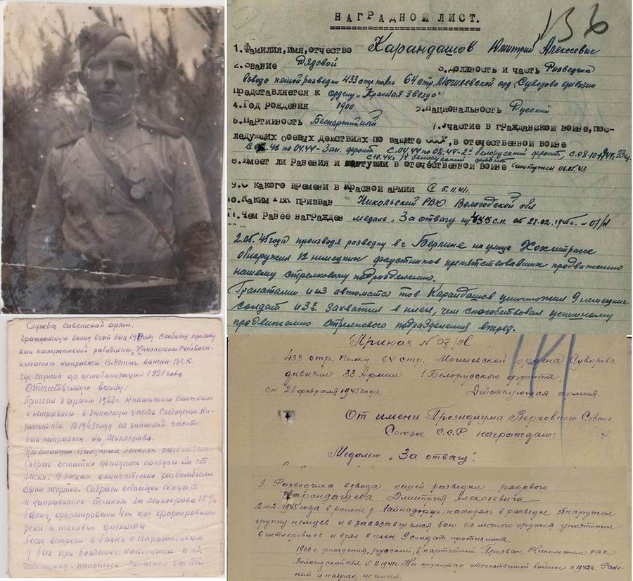 02.05.1945 г., производя разведку в г. Берлине, на улице Хохштрассе, обнаружил 12 фаустников, препятствующих продвижению нашего стрелкового подразделения.Гранатами и из автомата тов. Карандашев уничтожил 9 немецких солдат и 3-х захватил в плен, чем способствовал успешному продвижению подразделения вперёд);