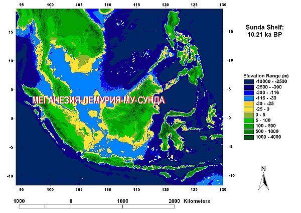 «Меганезия» или «страна Лемурия», или «страна Му», или Сунда (по-научному) – это легендарная страна Юго-Восточной Азии, реально существующая в данное и последующее время (50 000-10 000 до н.э.) на месте современных мелководных морей и континентального шельфа к юго-востоку от Индостана. Конкретно Меганезия-Лемурия-Му-Сунда располагается между островом Калимантан и полуостровом Малакка с одной стороны, а также между островами Суматра и Ява – с другой.