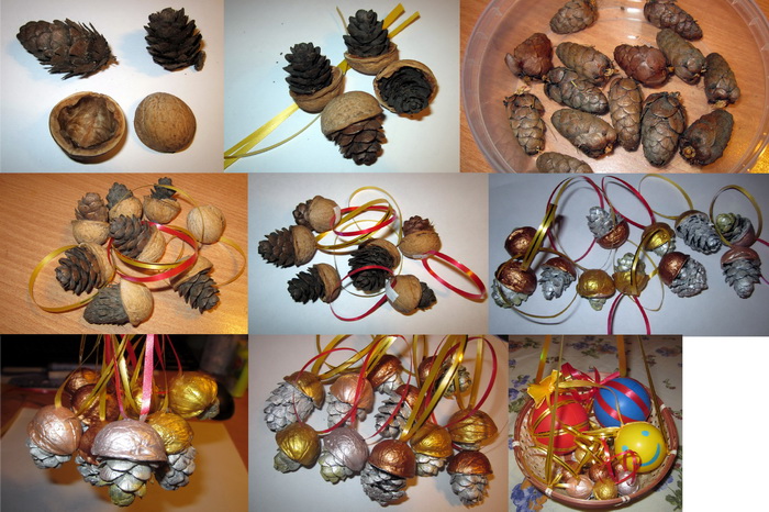 Затем в каждую скорлупку налить немного клея и поместить туда шишки, прижать и оставить на некоторое время, чтобы клей схватился. Из подарочных лент нарезать тонкие полоски нужной длины и с помощью небольшого бумажного квадратика приклеить их к внешней стороне скорлупы орехов.