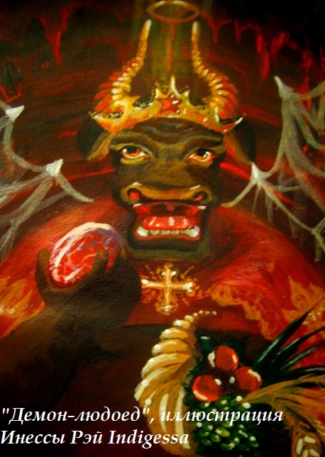 ~ За огромным столом, ломящимся от спелых угощений, он сидит бес конца… Всё ест и ест, и никак не насытится. Кроваво-красный стол этот всегда щедро уставлен самыми соблазнительными и сытными яствами. И стол настолько длинный, что напоминает сплошную ковровую дорожку, что покорно стелется к его ожиревшим ногам с золотыми копытами. Такой шикарной трапезы не может представить ни одна и самая богатая человеческая фантазия. Такое может быть лишь в аду, в его первой ступени, ведущей только вниз.