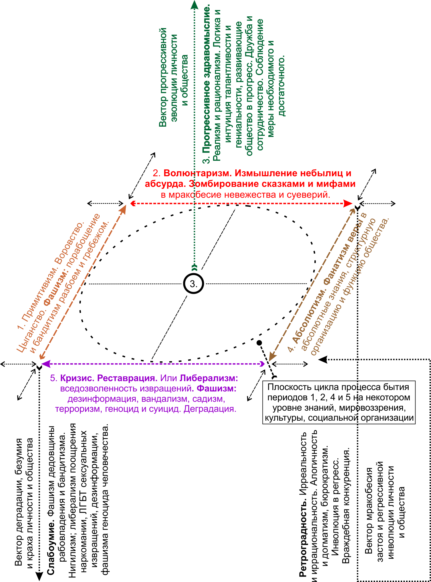 Деградированные уже не цивилизованные общины и страны базируются на нигилизме отрицания ценности любых знаний, анархии продуцирования и реализации на практике сюжетов галлюцинаций и бреда наркотического опьянения и сумасшествия; маниакальности проявления вандализма, садизма, терроризма, геноцида и шахидско-камикадзевского суицида, а также на безумии.