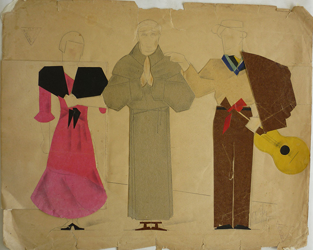На рисунке изображены три персонажа в костюмах во время танца: танцовщица, католический священнослужитель и мужчина с гитарой в руках..