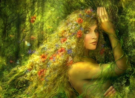 Он обернулся. Напротив него стояла девушка. Выглядела она так необычно свежо, будто сама была частью этого леса. Одета она была в очень странные одежды. Казалось это растения и цветы. Они облегали её фигуру так изящно, что у него на несколько секунд перехватило дыхание.