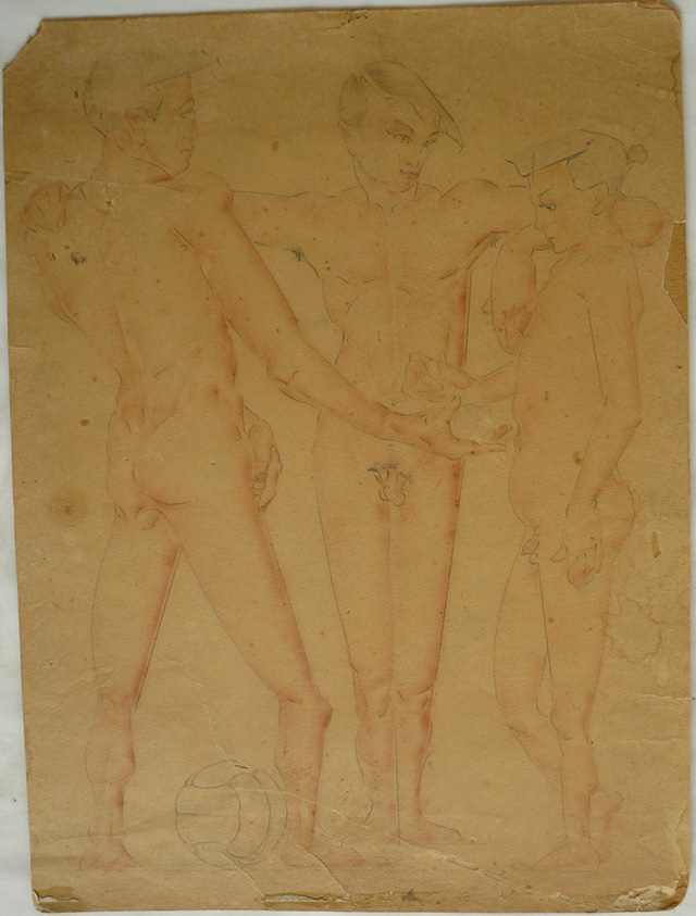 На рисунке трое обнажённых молодых людей с футбольным мячом.