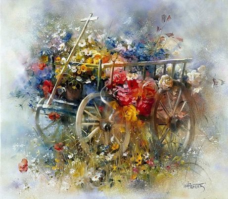 Цветочная тележка, полная свежесрезанных цветов, застряла колесом в какой-то небольшой выбоине... и поскрипывая, старалась выбраться...
