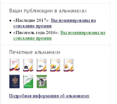 Меня на Стихи.ру номинировали на литературную премию «Поэт года 2016», а на Проза.ру - на лит.премию «Наследие 2017» (как раннее - на литературную премию имени Сергея Есенина «Русь моя» (2016) http://www.proza.ru/2016/06/24/1566 и национальную литературную премию "Писатель года-2016" http://www.proza.ru/2016/06/24/1598 ) . Скрины здесь https://twitter.com/BizDirektor/status/783339624727019520