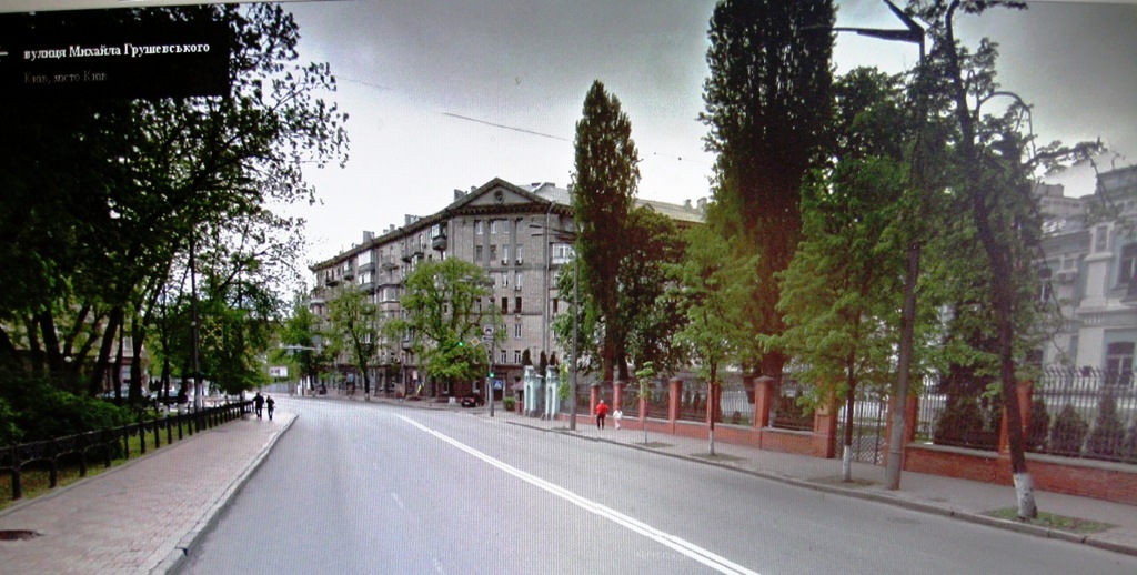 Идем далее.Против парка через дорогу – красный забор: Бывший Дворец пионеров. (После войны) Теперь – Китайское посольство. Далее жилой дом постройки 1956 года номер 34/1.Напротив этого дома, по диагонели через дорогу, находится выход-вход в Мариинский парк у дома 9 (розовеет сквозь листву парка)