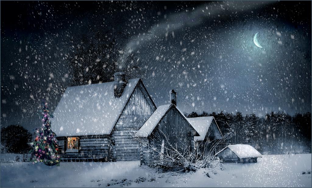 В лісі тихо, сніжинки падали і кожна ялинка була білосніжна. Звірі поховалися, не було видно а ні зайчика , ні білочки. Напевно всі вийдуть вже у Новорічну ніч. Сніг перестане падати і на горизонті випливе місяць. Зорі в небі замерехтять і кожна зірочка засвітить замість гірлянд.