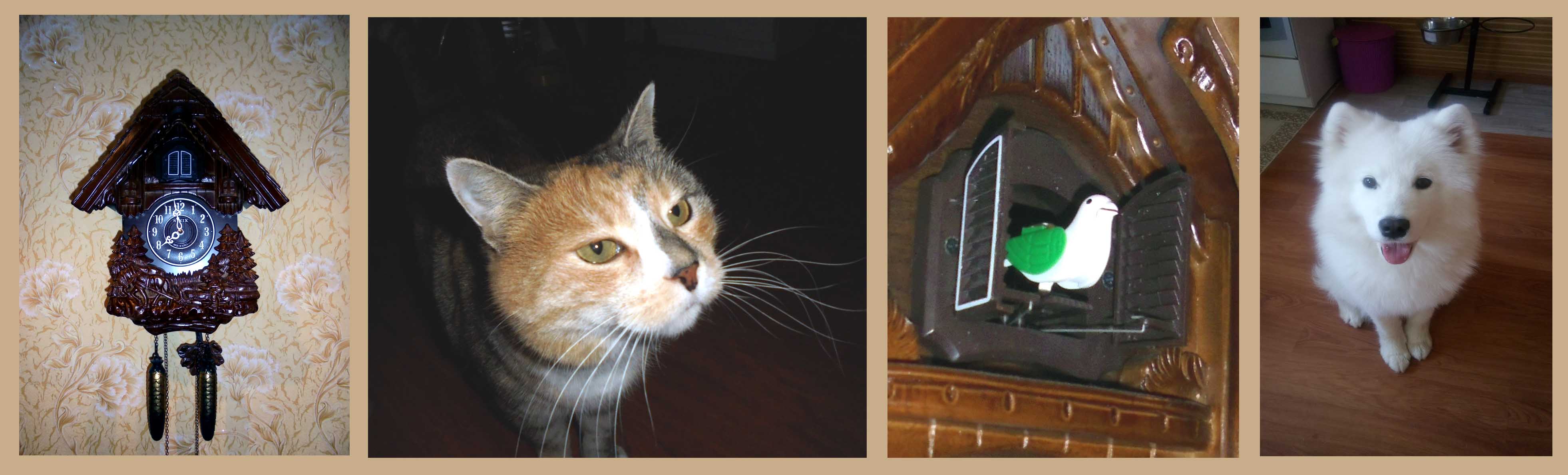 Недавно появилось в домике новое живое существо – абсолютный альбинос по своей собачьей породе собачка Тайга, самоед. Её подарили внучке Тане добрые друзья. Про Тайгу можно много рассказывать – Таня серьёзно увлеклась кинологией, возит собаку на занятия, а питомица проявляет хорошие ученические навыки, радуя хозяйку. И вот при Тайге впервые из часов выскочила белая кукушка. Реакция собаки оказалась точь-в-точь кошачьей, хотя живых птиц Тайга ещё толком и не видала. Подняв голову на часы, несколько секунд полюбовавшись представлением, собака больше не обращает внимания на эту неживую птичку.