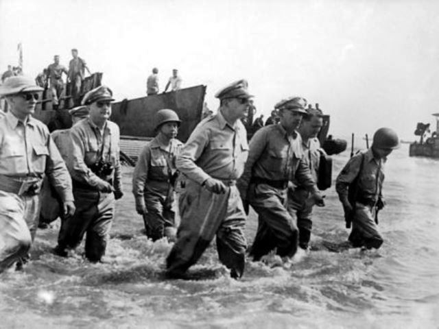 Генерал Макартур, любил театральные эффекты, и покрасоваться перед публикой. Он сошёл на Красный Берег, бредя по воде, в сопровождении свиты и военных корреспондентов, которым тоже пришлось намочить брюки.