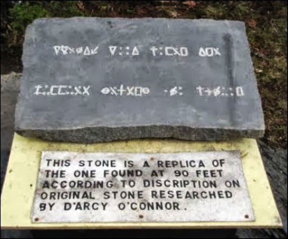 Предполагаемая копия надписей на камне приведена в книге Эдварда Сноу «Правдивые истории о захороненном сокровище», изданной в 1962 году. Если верить Сноу, то преподобный А.Т. Кемптон из Кембриджа, штата Массачусетс, рассказал, что старый школьный учитель-ирландец расшифровал надпись так: «Сорока футами ниже захоронены два миллиона фунтов стерлингов».