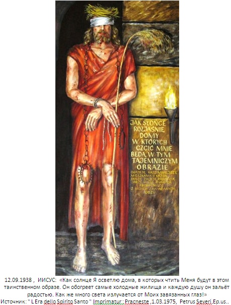 12.09.1938 , ИИСУС: «Как солнце Я осветлю дома, в которых чтить Меня будут в этом таинственном образе. Он обогреет самые холодные жилища и каждую душу он зальёт радостью. Как же много света излучается от Моих завязанных глаз!»