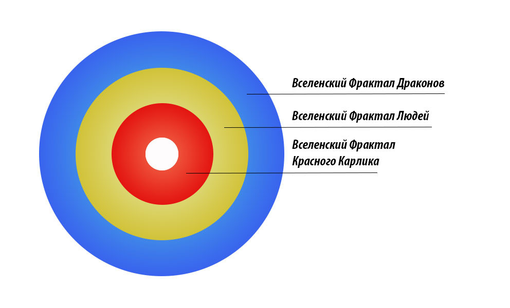 На приложенном рисунке я показал фрагмент из своей карты-схемы, что самую большую размерность, или кольцо, занимает Вселенский фрактал драконов** с большим числом возможностей, чуть ниже находимся мы, люди (наш Вселенский фрактал), а самое маленькое и нижнее кольцо – эту размерность когда-то занимал Красный Карлик, Вселенский фрактал которого в данный момент сместили фоморы и заняли их место, низвергнув тех на более меньшую и бедную числом измерений худшую позицию… Кстати, тоже самое может ждать и нас, жителей этой размерности, если мы не подготовимся заранее к этому и не дадим им отпор…