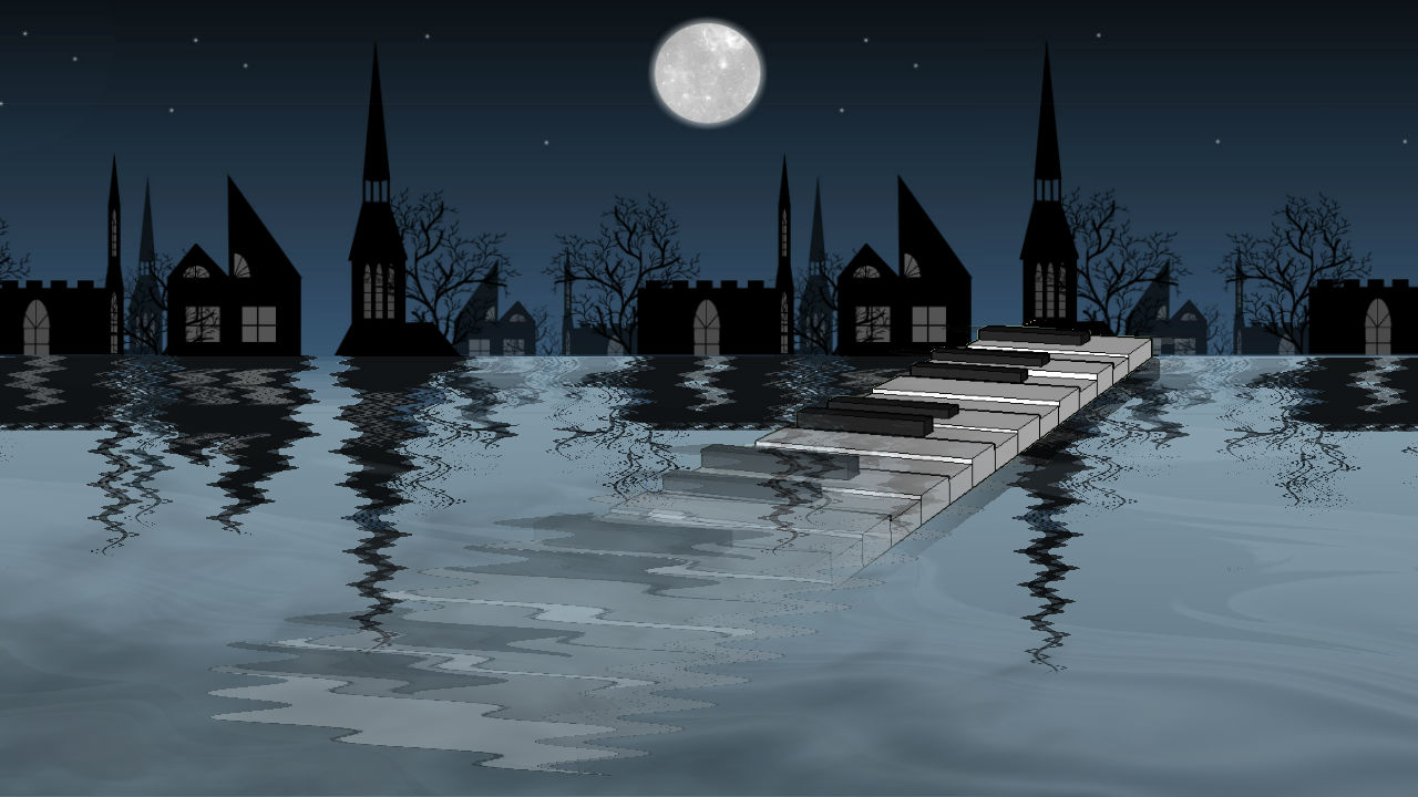 Человечек в скорлупке плывет по реке посреди осеннего леса в тумане – постепенно становится непонятно, что это – то ли река, то ли изогнутые клавиши пианино. Скорлупка подплывает к берегу, на котором стоит красивый город – из воды в город ведет лестница, так же выполненная в стиле клавиш пианино. По этим клавишам герой поднимается в город, идет по клавишной улице. К домам вместо фонарей на красивых крюках подвешены вместо фонарей маленькие кафе с ярко освещенными окнами – в одно такое кафе заходит герой.