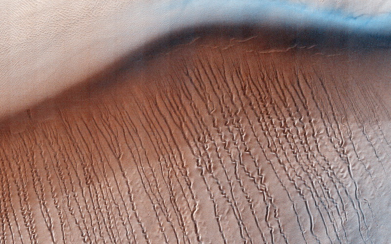 В центральной части снимка видны длинные линии, похожие на царапины, которые тянутся на юго-восток по склону дюны. Но если присмотреться внимательнее, можно увидеть, что эти «царапины» на самом деле проложили вниз очень извилистые дорожки. Эти образования являются линейными оврагами.