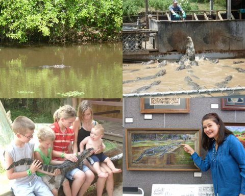 На ферме туристы ходят по приподнятым над землёй и водой дощатым тротуарам, к тому же огороженным сеткой. А аллигаторы занимаются своими аллигаторскими будничными делами внизу. По сравнению с нашими гостями с севера я чувствовала себя «аборигеном», ведь я не только живу на Юге США, где водятся аллигаторы, но и видела одного из них на нашем заднем дворе в озере. Посетителям на ферме показывают аттракцион по кормлению аллигаторов курицей. Для меня было очень удивительным увидеть то, как высоко аллигаторы могут подпрыгивать из воды. Получал курицу как раз тот аллигатор, который выпрыгивал из воды проворнее, выше и быстрее всех остальных.