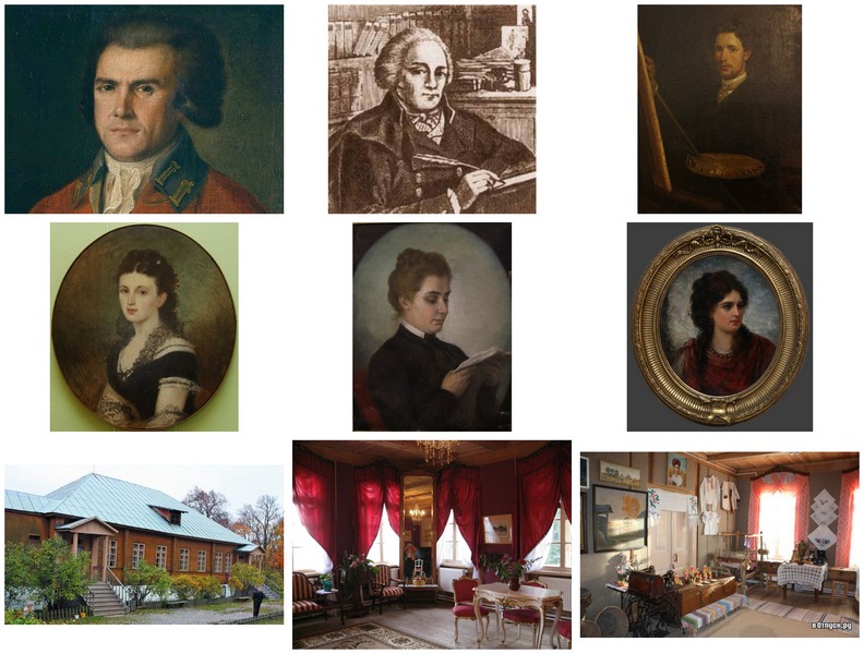 НА КОЛЛАЖЕ: АВТОПОРТРЕТ АНДРЕЯ ТИМОФЕЕВИЧА БОЛОТОВА В ВОЕННОМ МУНДИРЕ, ПОРТРЕТ ОТЦА В КАБИНЕТЕ РАБОТЫ ПАВЛА АНДРЕЕВИЧА БОЛОТОВА, АВТОПОРТРЕТ ДМИТРИЯ МИХАЙЛОВИЧА БОЛОТОВА.