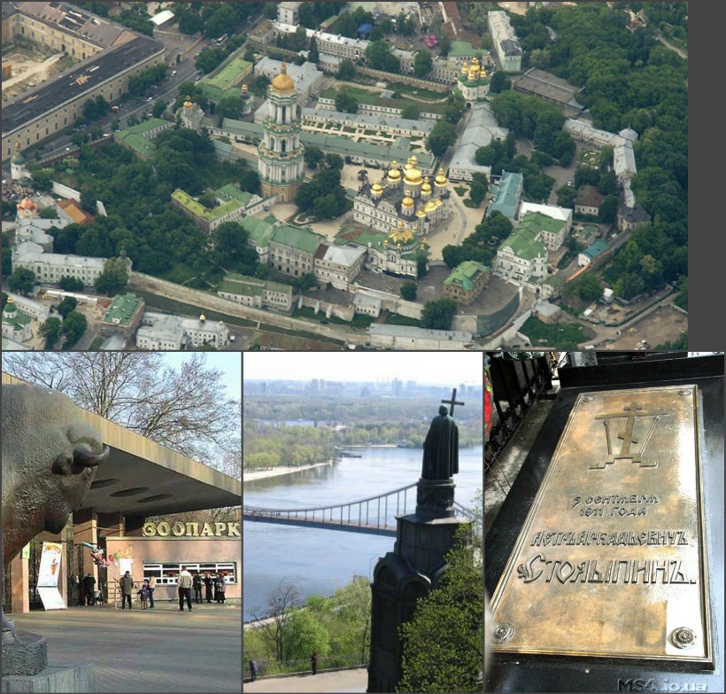 На фото:1. Киево-печерский монастырь. Вид с высоты птичьего полета.2. Центральный вход в городской зоопарк.3. Центр Киева. Памятник Владимиру крестителю. Река Днепр.4. Надгробие на могиле П.А.Столыпина.