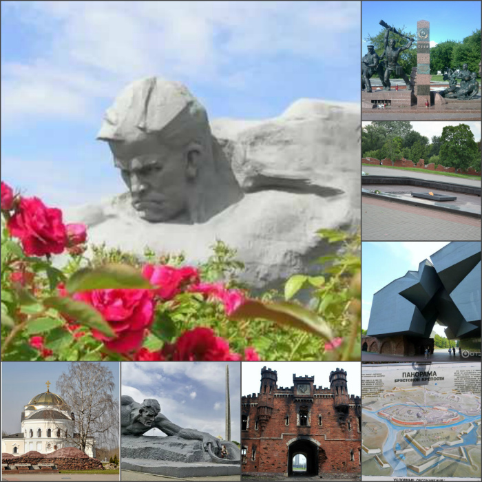 1.в центре-Главный монумент;2.(снизу. слева-направо и вверх)Свято-Николаевский гарнизонный храм (реконструирован после нашего посещения)Гарнизонный собор (Свято-Николаевский храм) У гарнизонного собора очень непростая история. Он был и церковью, и костелом, и даже армейским клубом. А в годы Второй мировой войны в «гости» сюда заходили Гитлер и Муссолини;3.Скульптурная композиция "Жажда";4.Главные ворота крепости;5.План-схема-панорама Брестской крепости;6.Главный вход в Мемориальный комплекс «Звезда»;7.Вечный огонь;8.Скульптурная композиция «Героям границы, женщинам и детям мужеством своим в бессмертие шагнувшим»;