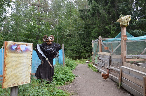 К рассказу встретившего нас хозяина этого удивительного объекта культуры внимательно прислушивался стоявший поблизости ушастый Уркаган в добрых полтора человеческих роста. Одет он был в чёрное одеяние, за пояс которого лихо заткнул огромное птичье перо. Как оказалось, здесь же в лесу он подобрал перо, которое уронила Дева-жар-птица, только что присевшая на соседствовавшее с избушкой дерево и не успевшая даже сложить крылья. Дева внимательно и доброжелательно смотрела на нас из-под улыбавшегося нам и покровительствовавшего ей Солнышка. А вот другая птица, лесная сова Мудреевна, косила на нас одним глазом со столба, с которого начиналось... контактное приусадебное хозяйство. Поскольку лесных мышек, то есть любимой пищи этой ночной хищницы, мы нигде не заметили, то решили, что важная Мудреевна своим вторым глазом выполняет роль счетовода поголовья этого самого приусадебного хозяйства.