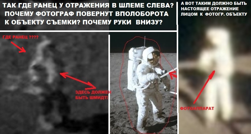 Кстати, мошенники из НАСА любезно предоставили нам возможность убедиться воочию, что перед нами в шлеме отражен подставной клоун. Дураков везде хватает. ОНИ РАСПОЛОЖИЛИ В КАДРЕ СНИМАЕМЫЙ ОБЪЕКТ (ЯКОБЫ СЕРНАН), И ОТРАЖЕНИЕ РАБОЧЕГО В ОДНОМ РАКУРСЕ - ВПОЛОБОРОТА К КАМЕРЕ. Теперь, сравнив отражение в левом фото и фигуру в полный рост на среднем фото, очень удобно видеть - ни ранца, ни фотоаппарата у подсобного рабочего нет! А руки расположены внизу.