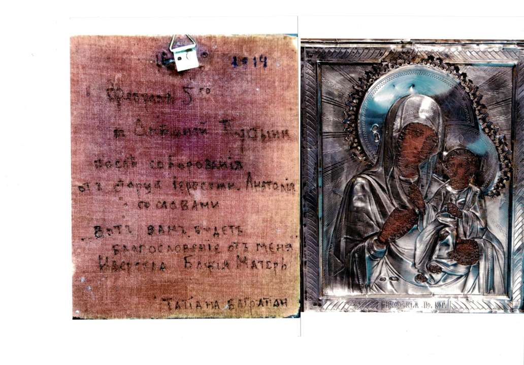 На этой деревянной иконе с серебряным окладом (18 х 11 см) изображен Лик Божией Матери Иверской. На обратной стороне иконы Татьяна Константиновна начертала собственной рукою такие строки: