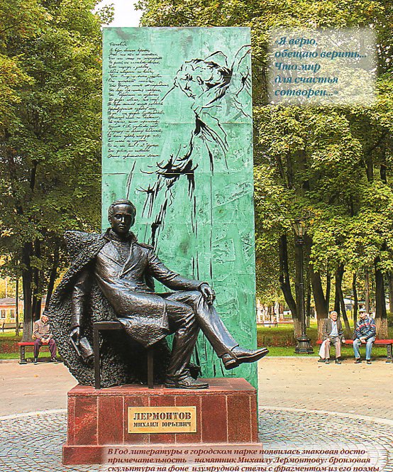 Неослабевающий интерес вызывает судьба Лермонтова. Это можно заметить и на страницах нашей "Проза.ру" и в нашем городе Подольске. Памятник любимому поэту появился и на территории школы №33 и в городском парке. В Год литературы в парке им. Талалихина появилась бронзовая скульптура Михаила Юрьевича Лермонтова. Она исполнена так, что невозможно пройти мимо, не поклонившись поэту. Лермонтов изображён на фоне изумрудной стелы с фрагментами из его поэмы "Исповедь".