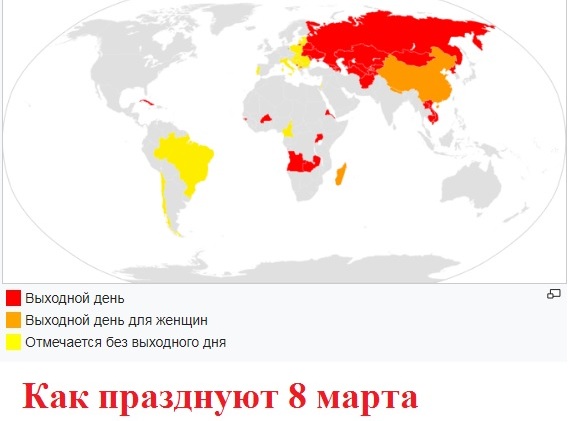 Да и теперь чего только ни случается. Взять, к примеру, недавнюю акцию #metoo и затюканных европейских мужичков, которые боятся случайно задеть своих эмансипированных дамочек полой пиджака? Однако в правильных странах, закрашенных на иллюстрации к этой миниатюре в яркие цвета, мужчины оказались догадливыми и изобретательными. И догадались они международный день женской солидарности перевести с политических рельсов на романтические. То есть день требований и борьбы за свои права всех стерв, мымр, скандалисток и феминисток превратить в Праздник весны и любви к прекрасной половине человечества. И попали в самую точку – улыбки, цветочки, подарки и слова любви растопили самые гордые и упрямые женские сердца . Ибо это все очень приятно слышать, видеть и получать от тех, кто рядом с тобой сейчас. И от тех, кто далеко в пространстве или во времени, но помнят, что ты есть и была в их жизни, и до сих пор испытывают тёплые чувства. От мужей и возлюбленных, отцов, сыновей и внуков. От коллег и учеников. От всех дорогих мужчин. И я хочу выразить им, мужчинам, своё восхищение за поразительную находчивость и историческую смекалку – за то, что они превратили нудное и нервное политическое мероприятие в один из самых прекрасных, нежных праздников - Праздник 8 Марта.