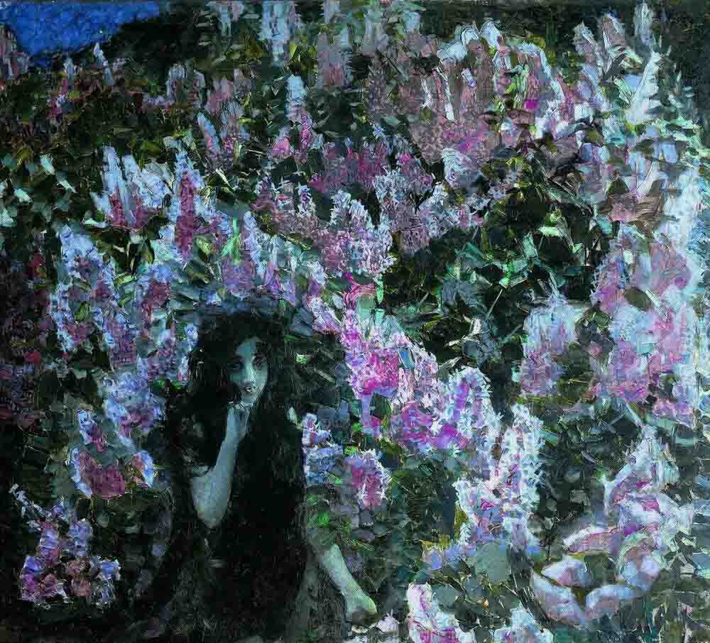 Гроздья сирени на этой картине – словно свечи природного храма, своей пышной красотой они втягивают зрителя в таинственный растительный мир, но этот мир цветения недолговечен – как недолговечны сильные любовные чувства, как недолговечна и сама жизнь на земле.