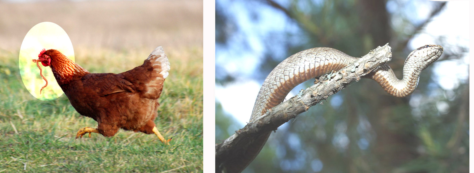 1. Курица обыкновенная, бегущая с медянкой обыкновенной.